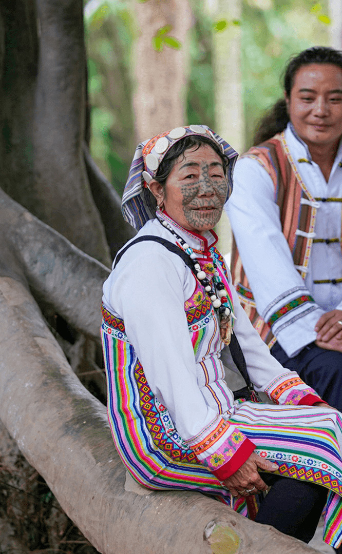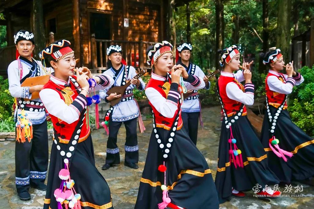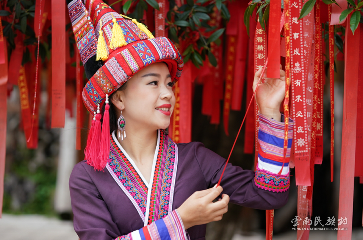 彝族在云南境內(nèi)約471萬(wàn)人,是省內(nèi)人口最多、分布最廣的少數(shù)民族,主要聚居在金沙江、元江流域和哀牢山、無(wú)量山腹地。彝族是一個(gè)能歌善舞的民族,民間打歌、跳樂(lè)之風(fēng)盛行,大三弦、跌腳舞久負(fù)盛名?;鸢压?jié)是彝族最具特色的民族節(jié)日。彝族村占地50余畝,三虎浮雕墻與虎頭內(nèi)祖師形象表現(xiàn)了彝族虎鷹文化。太陽(yáng)歷廣場(chǎng)圖騰柱上有太陽(yáng)、虎、火和八卦圖形象,周圍環(huán)繞著10個(gè)朝向不同的月球造型,外圓周有12生肖石雕。依山而建的“...